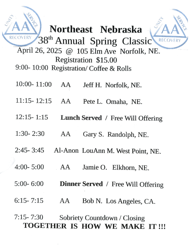 | 10:00-11:00 | AA | Jeff H., Norfolk, NE |