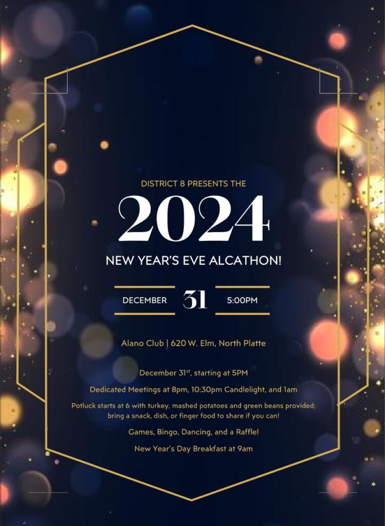 New Year's Eve Alcathon starting at 5:00 pm. Breakfast will be served at 9:00 am New Year's Day. Bingo, raffle, games music and fellowship! Meetings at 8pm, 10:30 pm and 1am.